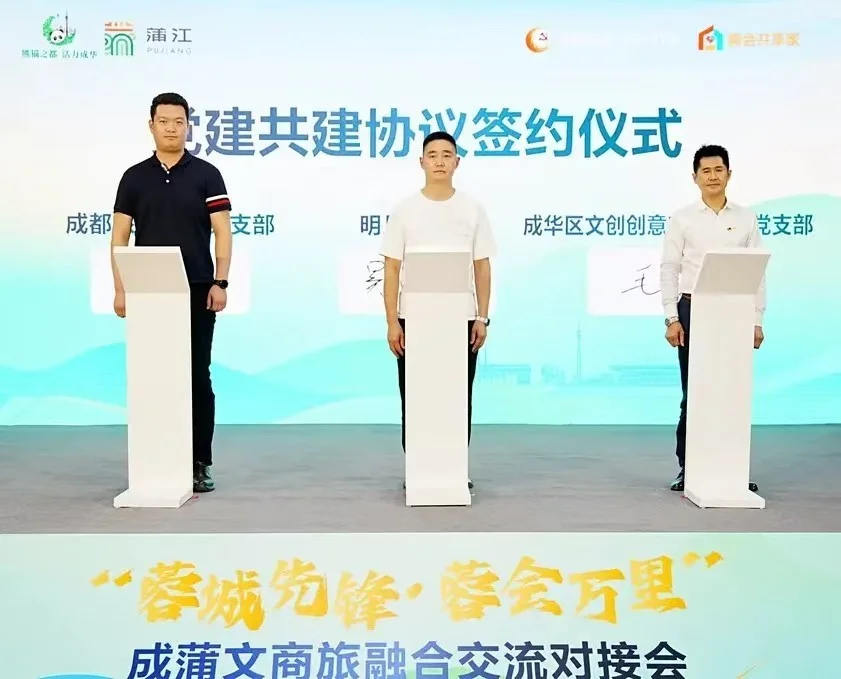 活动现场迎来多项合作成果落地。成都旅游协会党支部、成华区文化创意产业协会党支部与蒲江县明月村党委签订党建共建协议,三方将在文商旅产品开发、乡村文旅品牌打造等领域开展深度协作。成都融智互动与正阁蓉宴签约打造“智慧餐饮 + 文旅营销” 标杆案例,助力文旅消费场景升级。